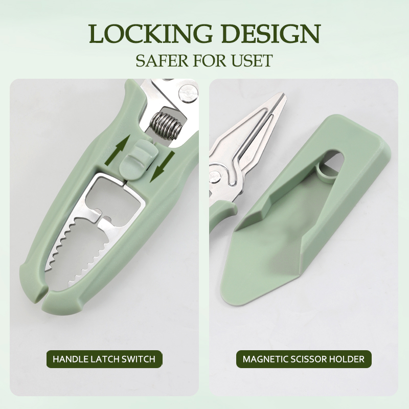 The shears feature a patented locking mechanism with an anti-rebound latch switch and reinforced spring system. This design prevents accidental blade exposure during storage or transport, significantly reducing workplace injuries—a critical consideration for high-traffic kitchens. The ergonomic PP (polypropylene) handle ensures a secure, non-slip grip even in wet conditions, minimizing hand fatigue during prolonged use. By prioritizing user safety, this tool aligns with modern workplace safety standards, making it a responsible choice for bulk procurement.
